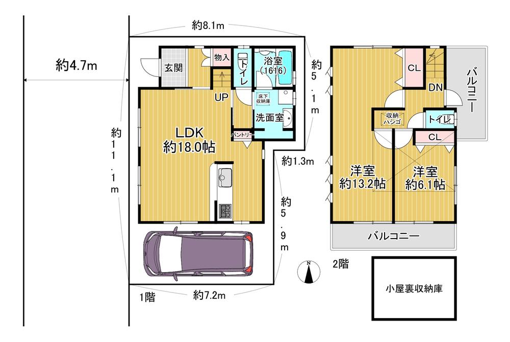| 私道負担 | 建物面積 | 1F 46.16㎡ 2F 40.99㎡ 延べ床面積87.15㎡(26.36坪) | |